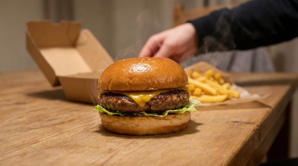 Take-away er frisk mad. Pak ud med det samme, når du kommer hjem, og spis, mens det hele er varmt og sprødt. Pommes holder sig bedst kort tid, og burgere har det bedst, når damp ikke fanges for længe i emballagen. Hvis du ved, at du spiser senere, så planlæg afhentningen derefter, så kvaliteten topper, når du sætter dig.